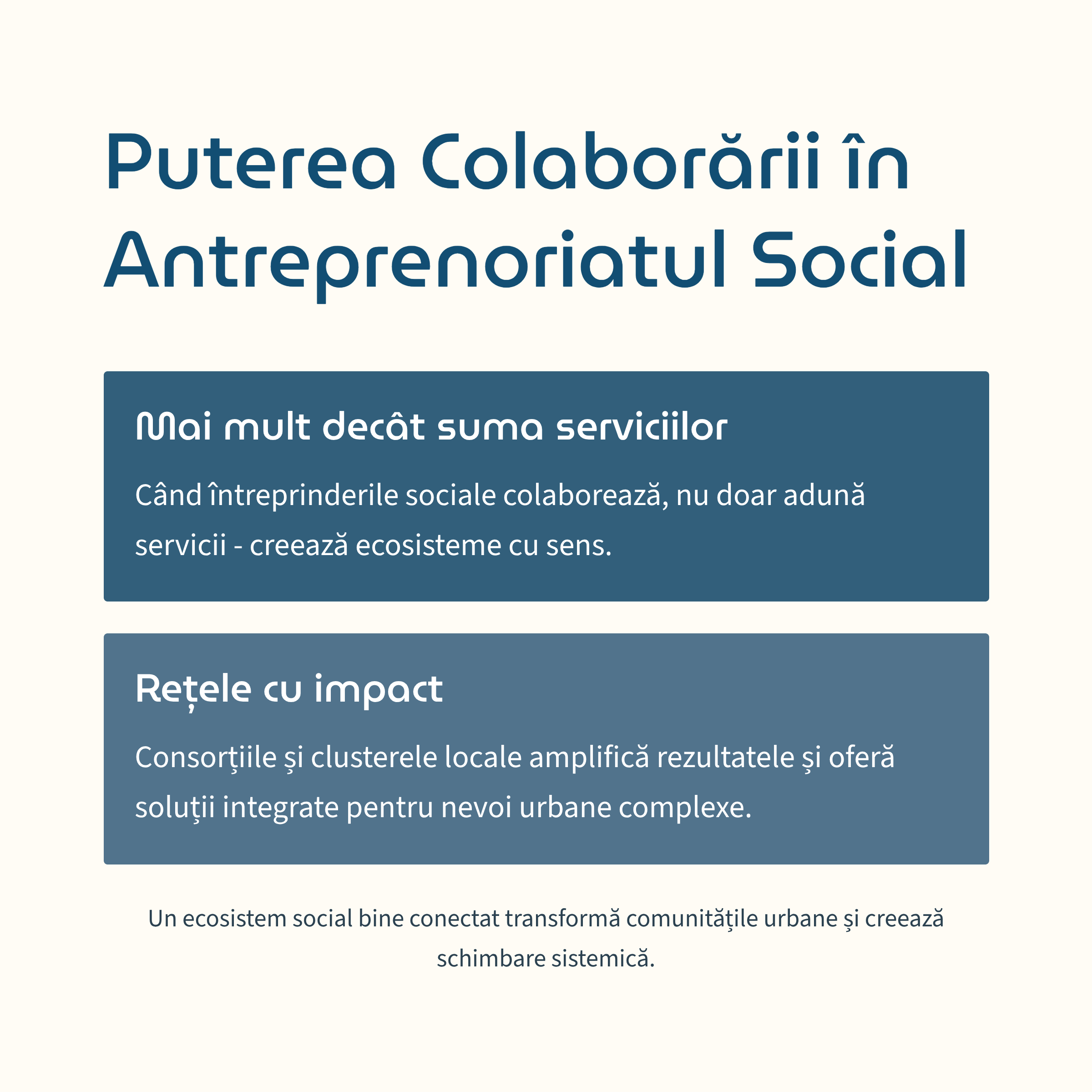 Când întreprinderile sociale aleg să colaboreze – să formeze o rețea, un consorțiu, un cluster local – rezultatele se amplifică. Nu se mai adună doar servicii, ci se construiește un ecosistem cu sens, capabil să ofere soluții integrate pentru nevoi complexe ale comunităților urbane.